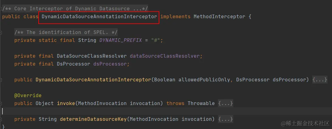 随后,如果进行数据库操作,以方法为最小粒度,执行对应方法时,会被 DynamicDataSourceAnnotationInterceptor拦截器拦截