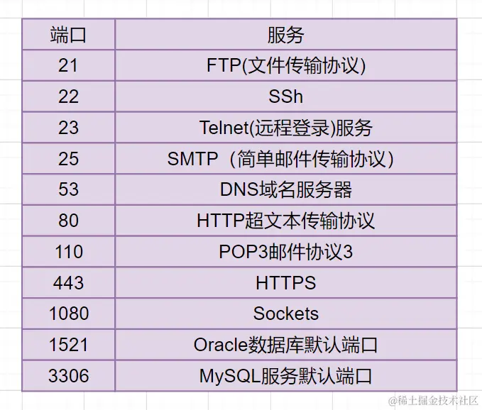 常见端口这个应该后端程序员都不陌生,这里就不献丑了,我随便举几个例子,然后面试的时候可以根据自己熟悉的直接说就可以了: