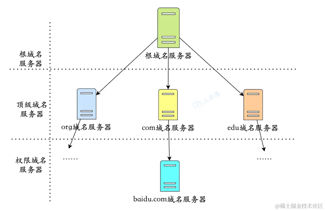 - 本地DNS服务器向根域名服务器发送请求,根域名服务器返回负责 com 的顶级域名服务器的IP地址的列表。