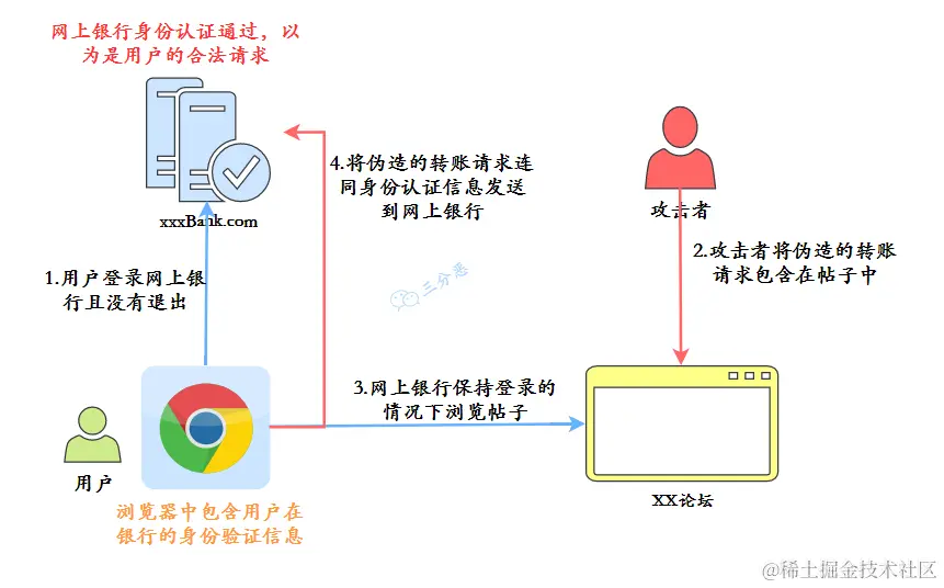 - 将伪造的转账请求连同身份认证信息,发送到银行网站