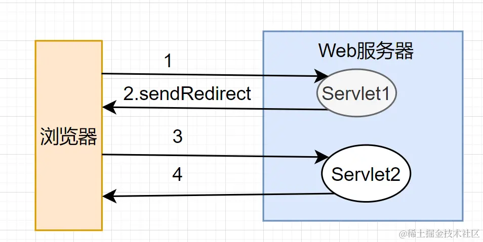 - 间接转发方式(Redirect) 实际是两次HTTP请求,服务器端在响应第一次请求的时候,让浏览器再向另外一个URL发出请求,从而达到转发的目的。