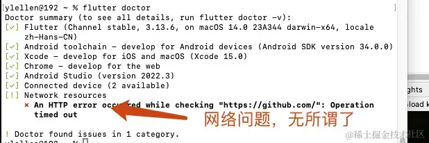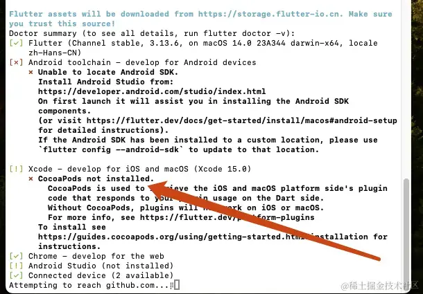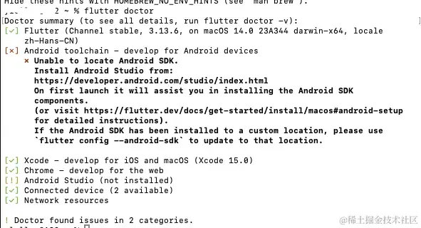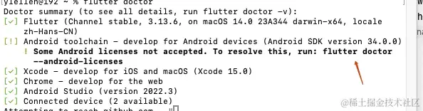 14、马上就快结束了,在终端内输入flutter doctor,出现这个界面,那就按照里面的命令:flutter doctor --android-licenses 输入,一直输入y