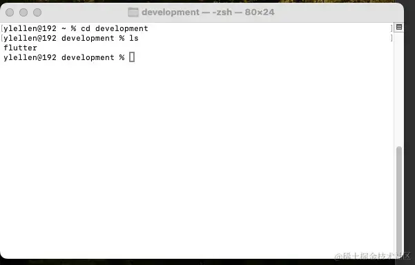 3.打开终端,输入cd development ,然后输入ls 就能查看到这个flutter 文件夹了