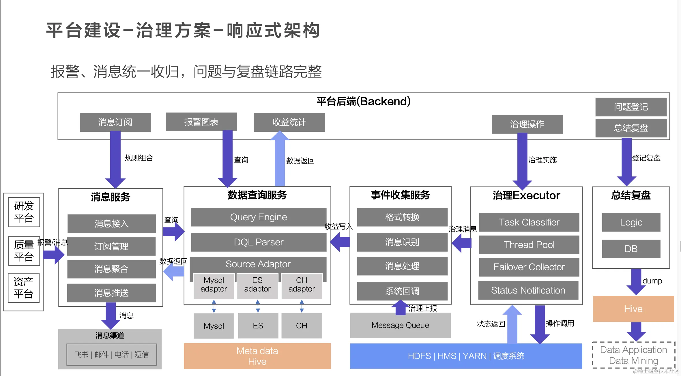主要有几个不同的部分。第一是左侧有个消息服务,因为我们这个路径其实是以消息来处发的,我们会打通与研发平台,质量平台,自然平台等很多处发消息和报警的一些平台,将他们的消息和报警统一收归到我们这个服务里面进行下发。下发的渠道可以有,比如说字节跳动用的飞书,或者邮件、电话、短信等等。这些消息形成的一些数据也会经由数据的收集放到查询服务里面,去做一些报警的展示。另外在消息这里,我们会和复盘模块进行强关联,对问题进行登记核准复盘。