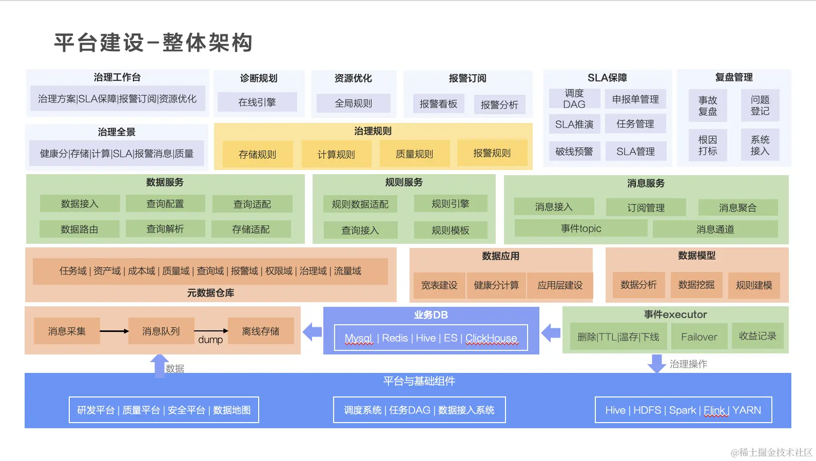 上面介绍了我们应对数据治理的解决方案,包括全规则、全链路和一站式。接下来,介绍具体的平台架构。
