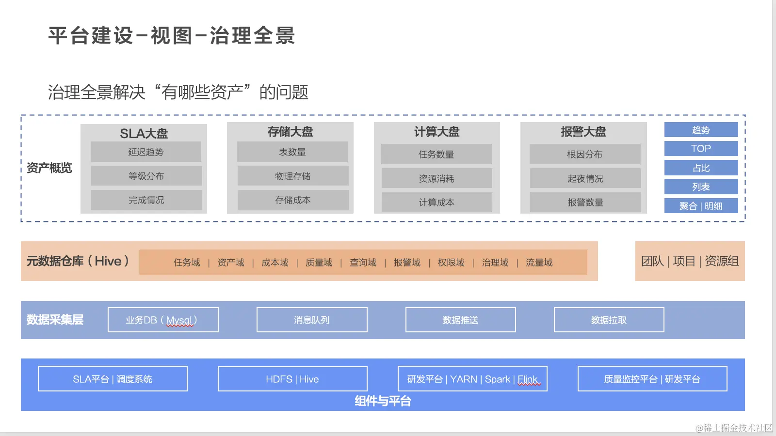 第一、治理全景。解决有哪些资产问题。目前在平台上有一些大盘,包括数据的SLA大盘、存储大盘、计算大盘、报警大盘等等,这些大盘针对于不同的治理场景会有一些不同维度的展示,包括一些数据趋势,一些占比列表,或者是一些聚合明细等数据。支撑治理全景的是我们底层的元数据仓库以及刚才说的数据应用的部分,对数据进行一些加工。