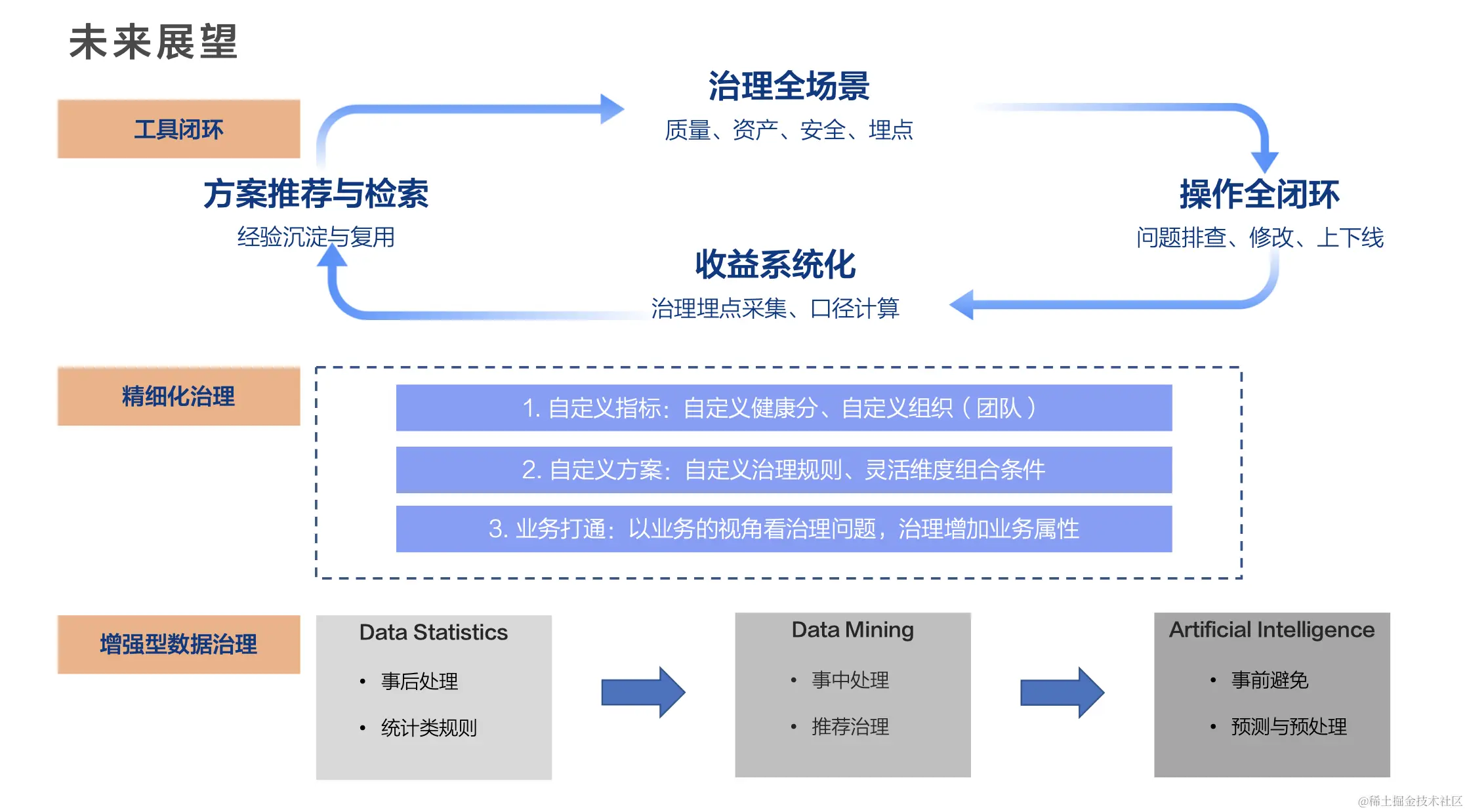 最后是增强型的数据治理,我们希望是能够在数据侧通过一些统计类、挖掘类,上升为一些算法和智能型的这种平台。