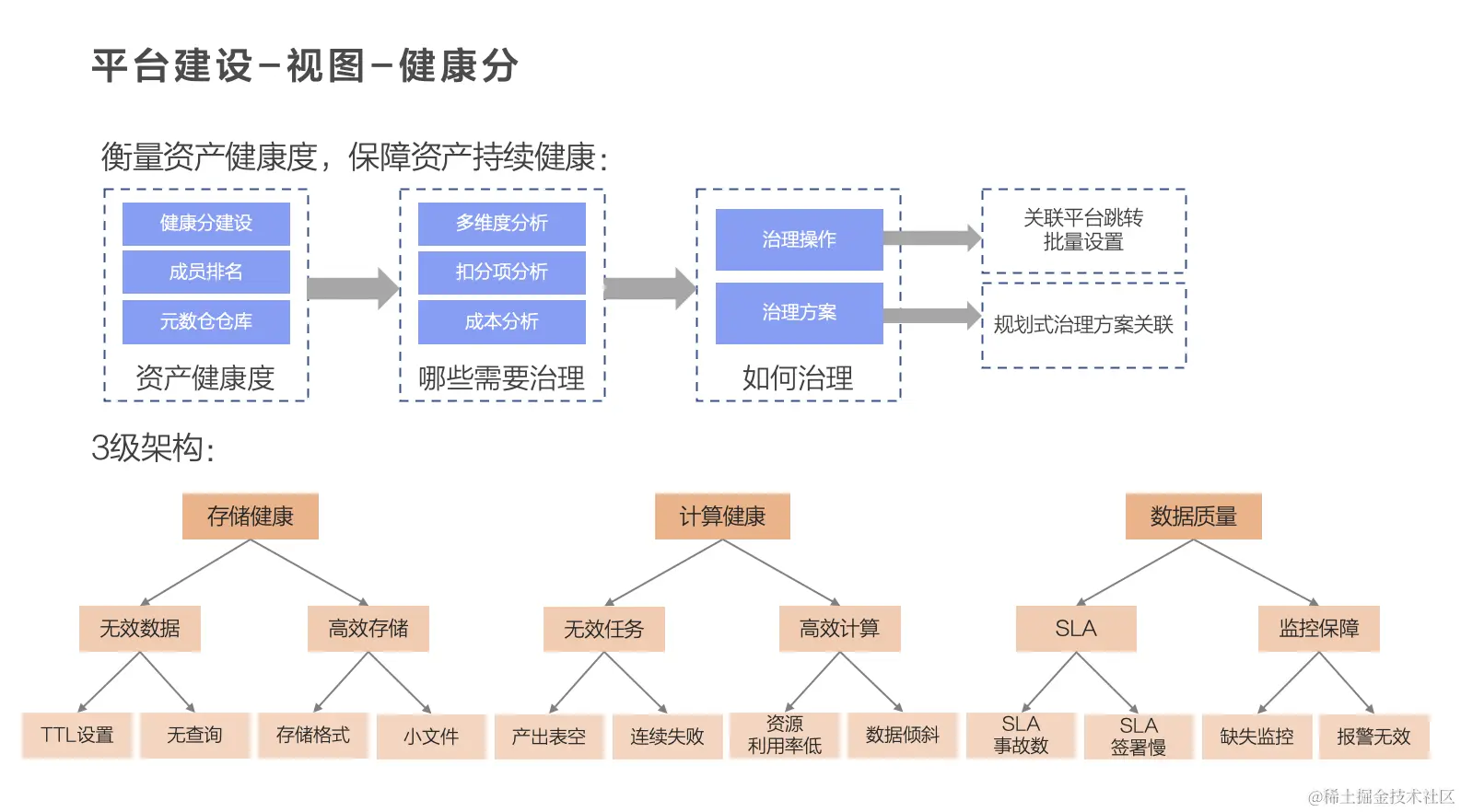 在健康分的设计方面,我们遵循了一个三层架构的思路。首先第一层是比较大宏观的资产层。包括存储的健康分,计算健康分,数据质量等等。第二层是针对于这一类自办的一些聚合类指标,包括比如说存储健康分里面的无效数据,或者是高效存储的问题。计算健康分里面无效任务和高效计算的问题。数据质量方面的SLA或者是监控保障的问题。最后一层是比较详细的规则层。包括存储里面TTL设置,或者是无查询的一些资产。比如说计算里面的连续失败任务或者是资源利用率比较低的一些任务。数据质量里面的一些SLA的事故数或者是一些监控的缺失、无效报警等等。