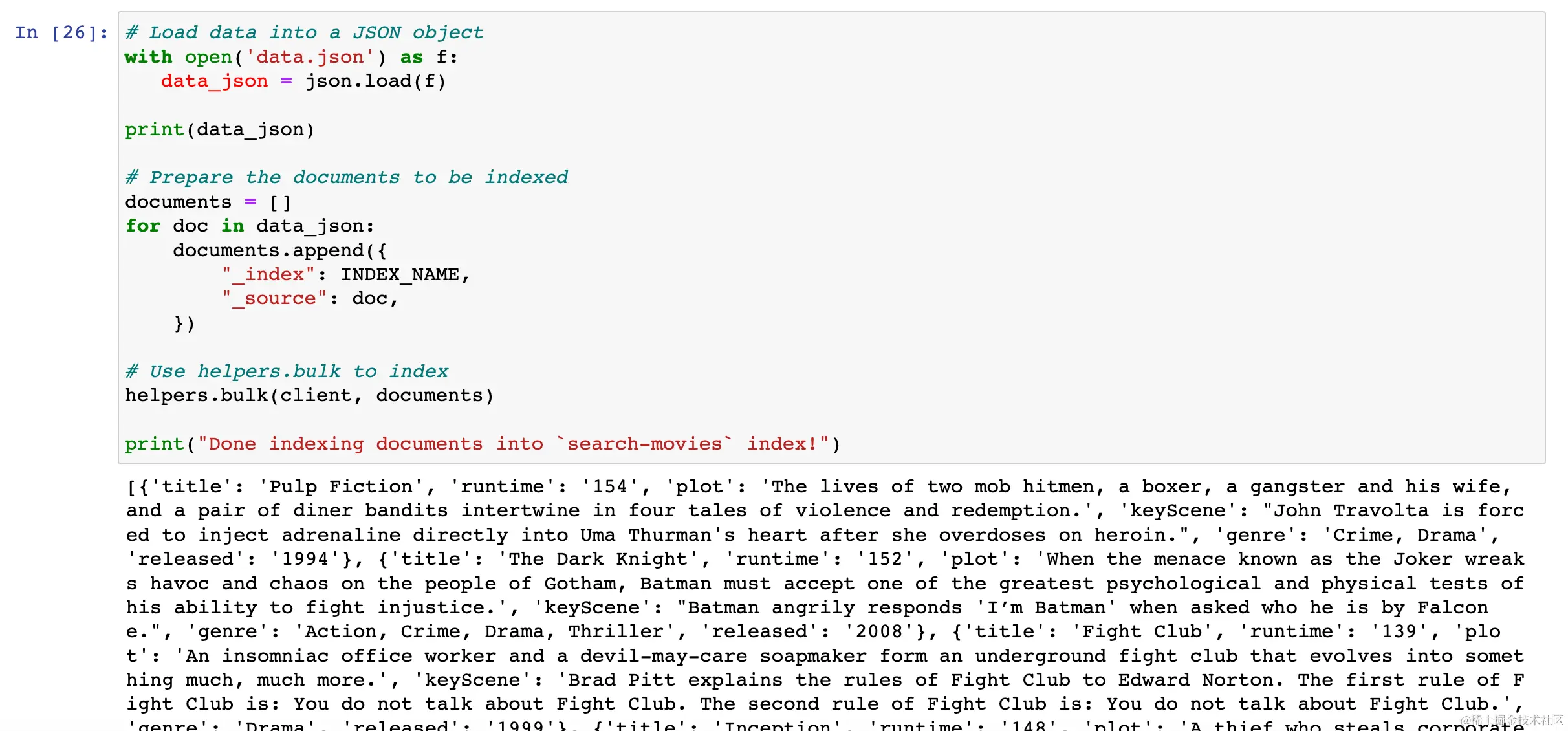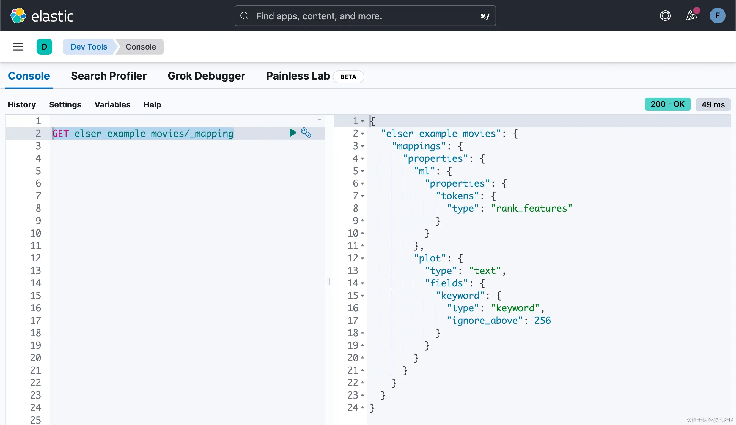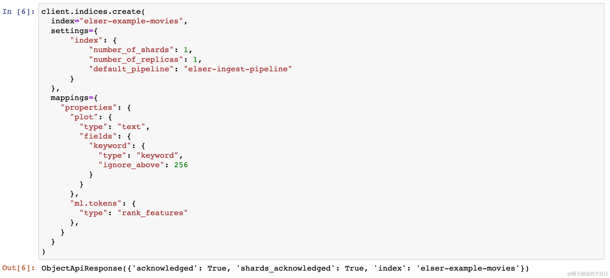 从上面的输出中,我们可以看到 elser-example-movies 索引已经被成功地创建。
