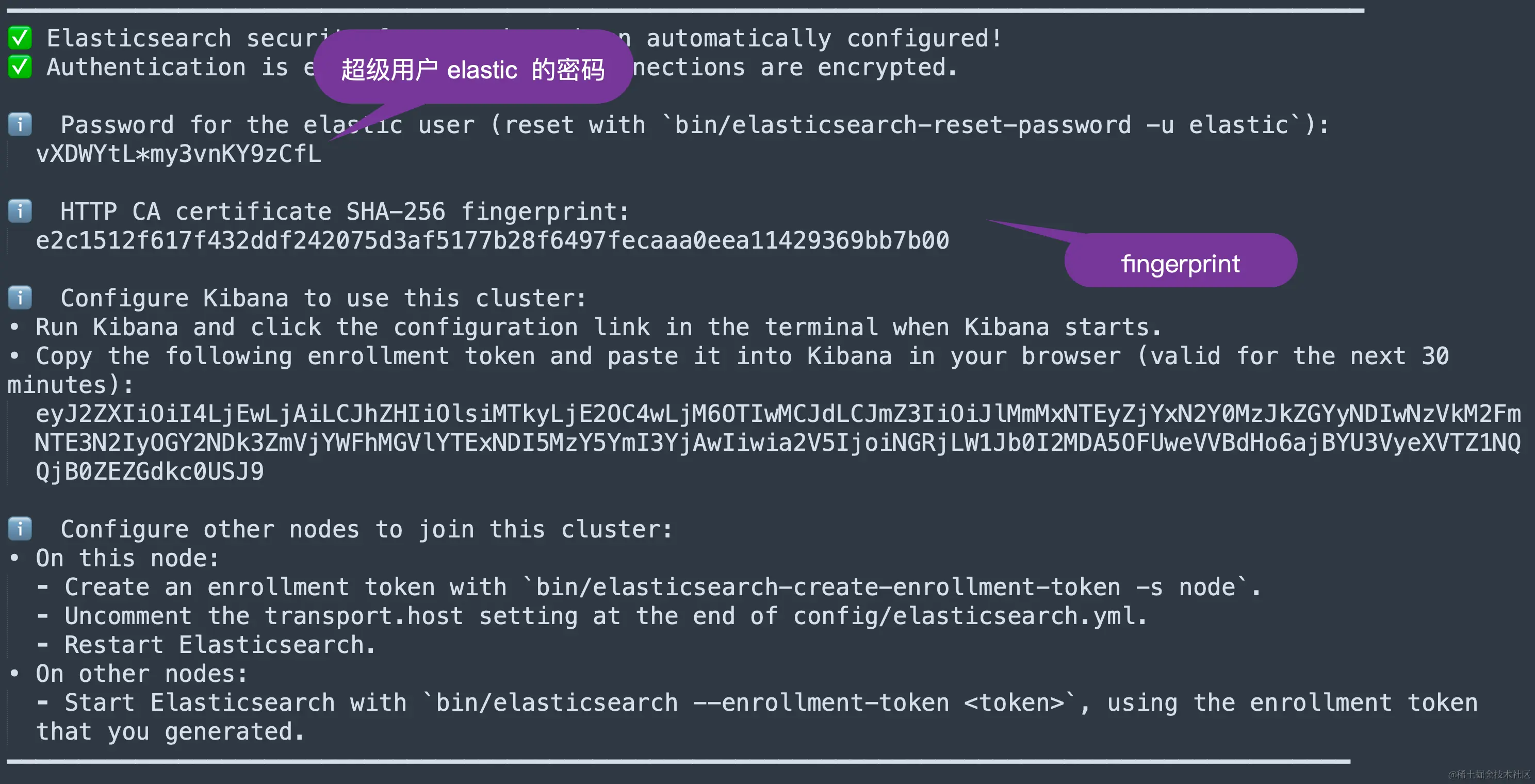 在安装 Elasticsearch 的过程中,我们需要记下如下的信息: