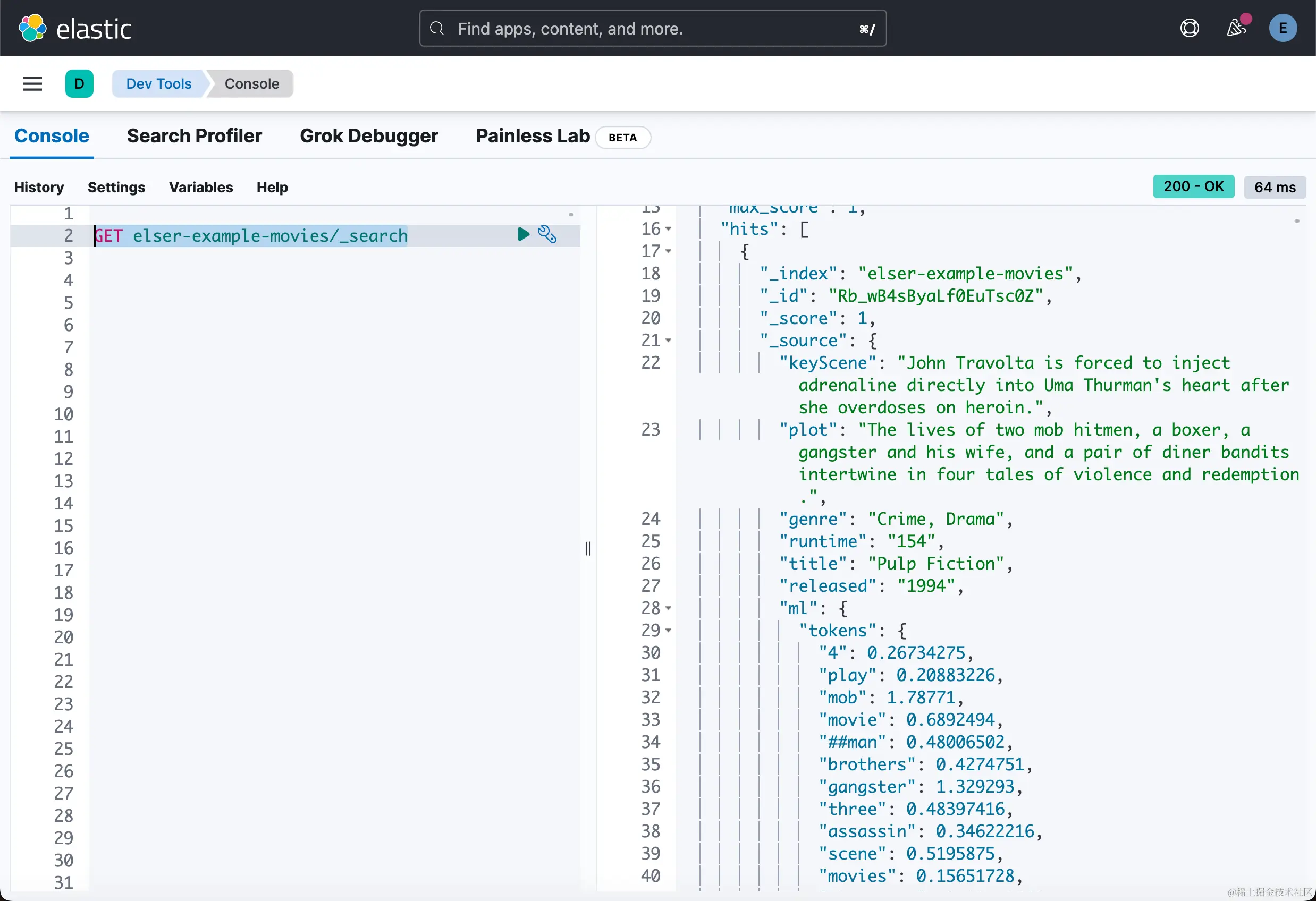 检查新文档以确认它现在有一个 "ml": {"tokens":...} 字段,其中包含新的附加术语列表。 这些术语是你针对 ELSER 推理的字段的文本扩展。 ELSER 实质上创建了一个扩展术语树,以提高文档的语义可搜索性。 我们将能够使用 text_expansion 查询来搜索这些文档。