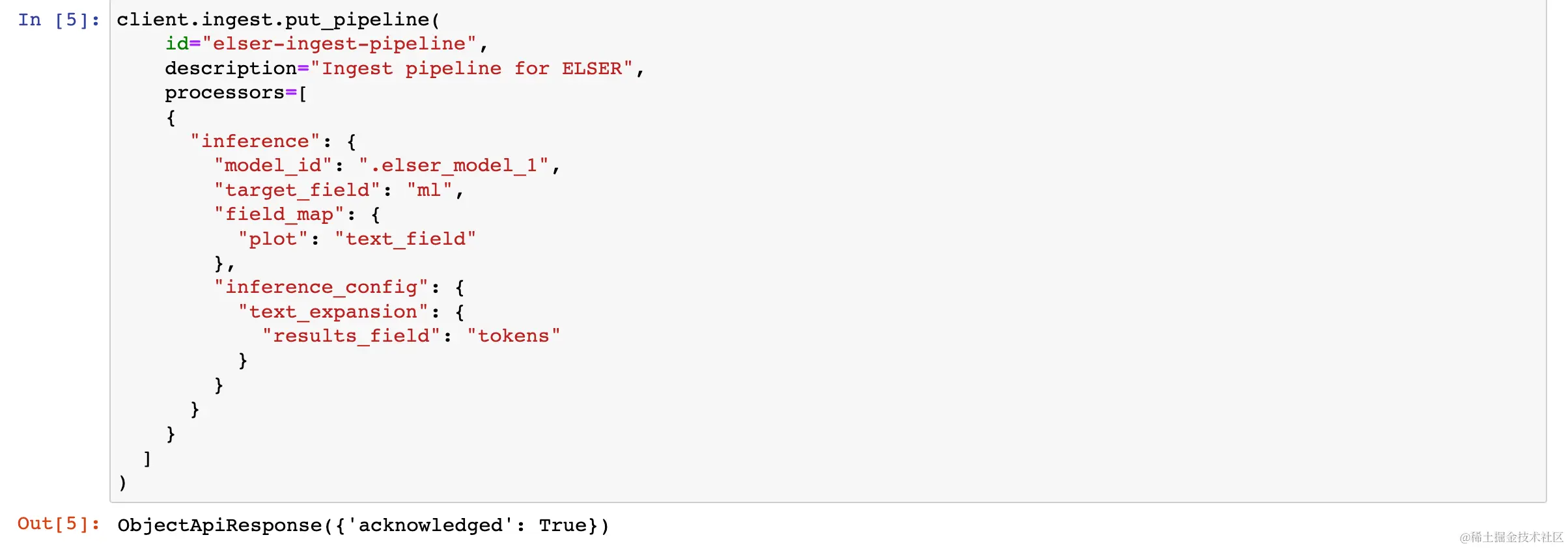 为了在我们的 Elasticsearch 集群上使用 ELSER,我们需要创建一个包含运行 ELSER 模型的推理处理器的摄取管道。 让我们使用 put_pipeline 方法添加该管道。