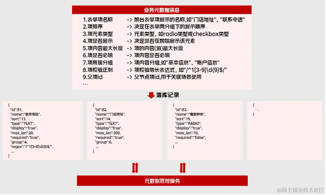 配置化表单离不开元数据设计,其中元数据指描述数据的数据。在本例中表单元数据即表单各业务项(指商品名称、商品创建时间、商品创建人等)可动态配置的核心能力。这一步将元数据配置中具有代表性的几个信息属性罗列出来,每项信息属性的用途见下图介绍。此外基于元数据信息封装元数据增删查改管理服务,实现元数据的动态配置基座。