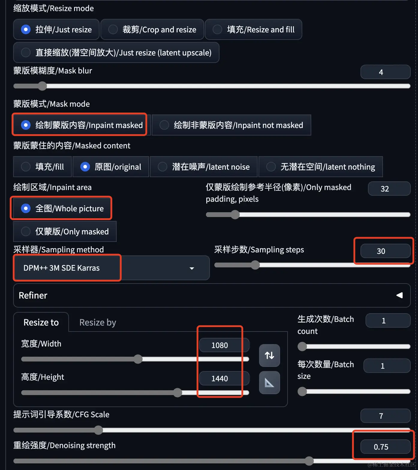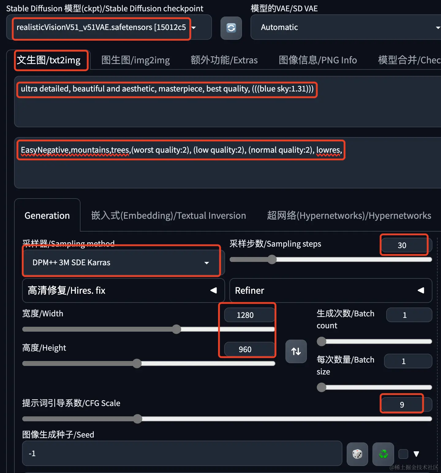 采样器基本上可以任意选择,注意搭配的采样步数。我这里选择最新的 DPM++ 3M SDE Karras,采样步数30。