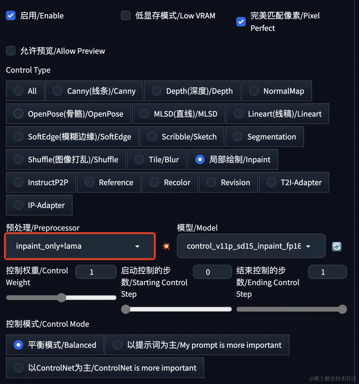 除了图生图的局部绘制能力,我们还可以使用ControlNet的局部绘制模型。