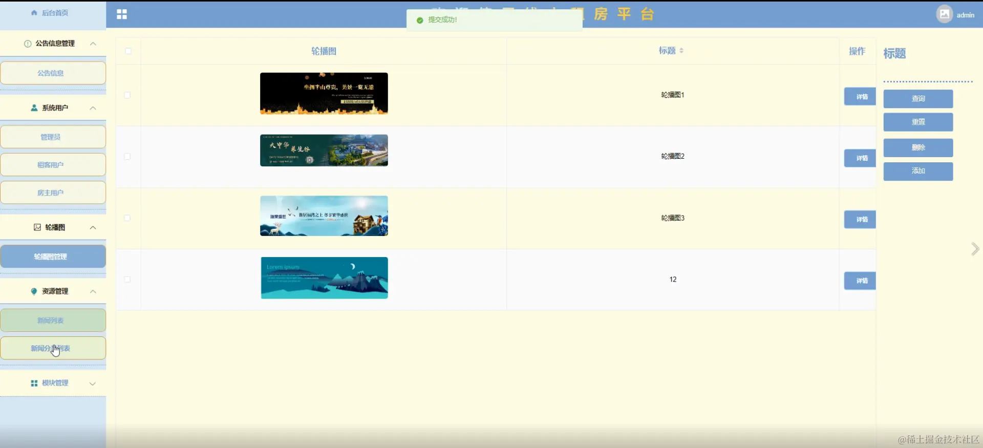 管理员可以查看后台服务端后台首页、轮播图管理、公告信息管理、系统用户(管理员、租客用户、房主用户)资源管理(新闻列表、新闻分类列表)模块管理(房源信息、房源咨询、租赁申请、入住信息、房租信息、反馈信息、通知信息、房屋类型)个人管理等操作。管理员服务端效果图如图5.2所示。