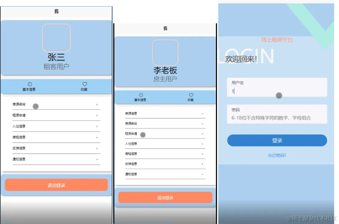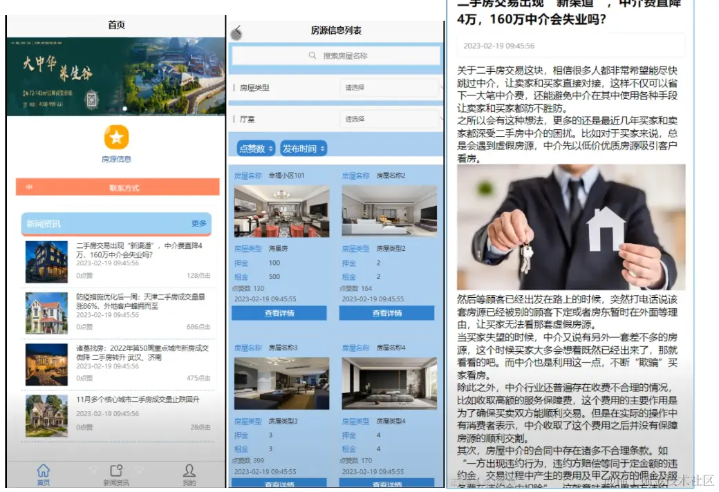 用户客户端:首页、公告信息、新闻资讯、房源信息等功能。
