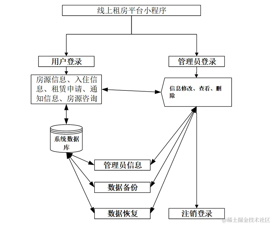 系统功能包括管理员服务端:首页、轮播图管理、公告信息管理、系统用户(管理员、租客用户、房主用户)资源管理(新闻列表、新闻分类列表)模块管理(房源信息、房源咨询、租赁申请、入住信息、房租信息、反馈信息、通知信息、房屋类型)个人管理;
