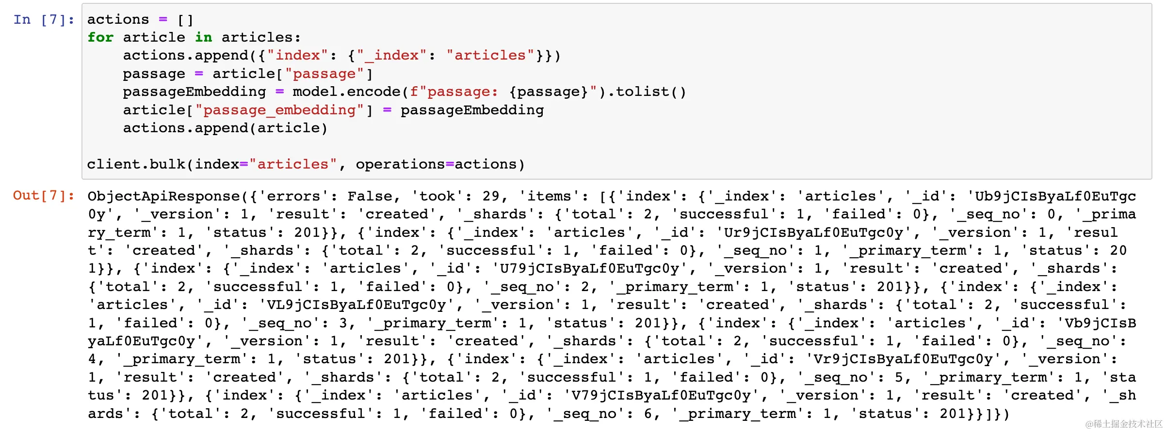 以下代码迭代文章并创建要执行的操作列表。 每个操作都是一个字典,其中包含对 Elasticsearch 索引的 “index” 操作。 该 passage 使用我们选择的模型进行编码,并将编码向量添加到文章文档中。 请注意,E5 模型要求使用前缀指令 “passage:” 来告诉模型要嵌入 passage。 在查询方面,查询字符串将以 “query:” 为前缀。 然后,文章文档将添加到操作列表中。