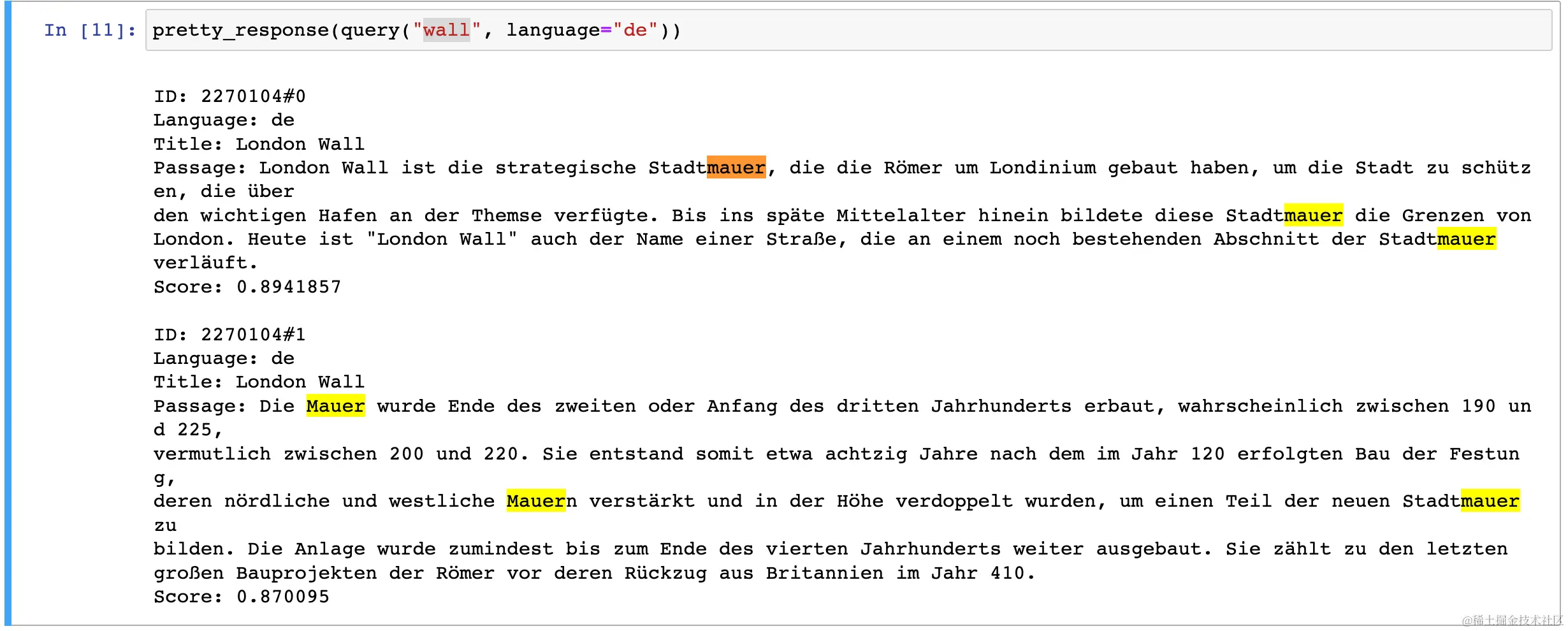 在上面,我们在德语文档里搜索德语单词 “Mauer”。我们可以看到 “London Wall” 文档也被正确搜索到了。