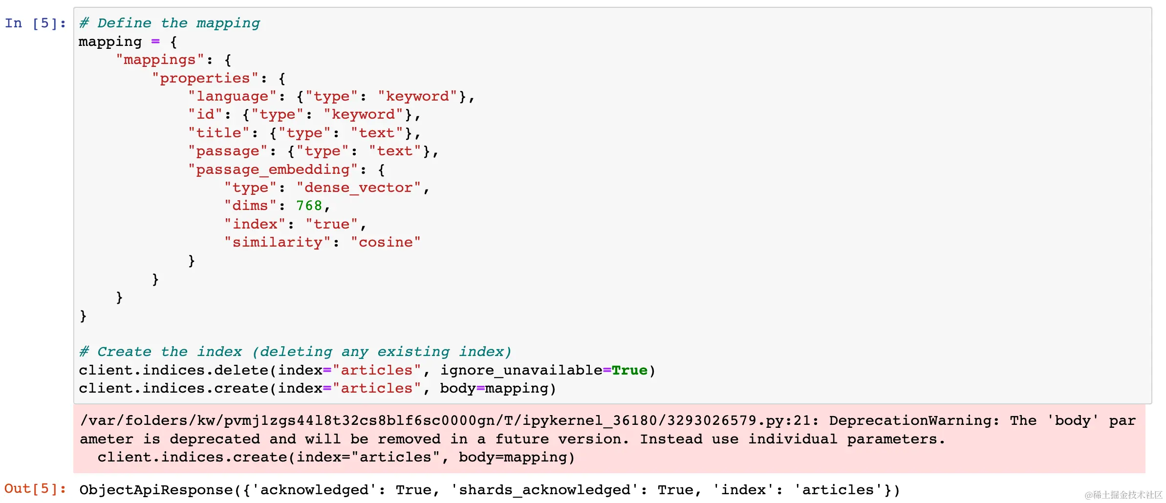 21. client.indices.create(index="articles", body=mapping)