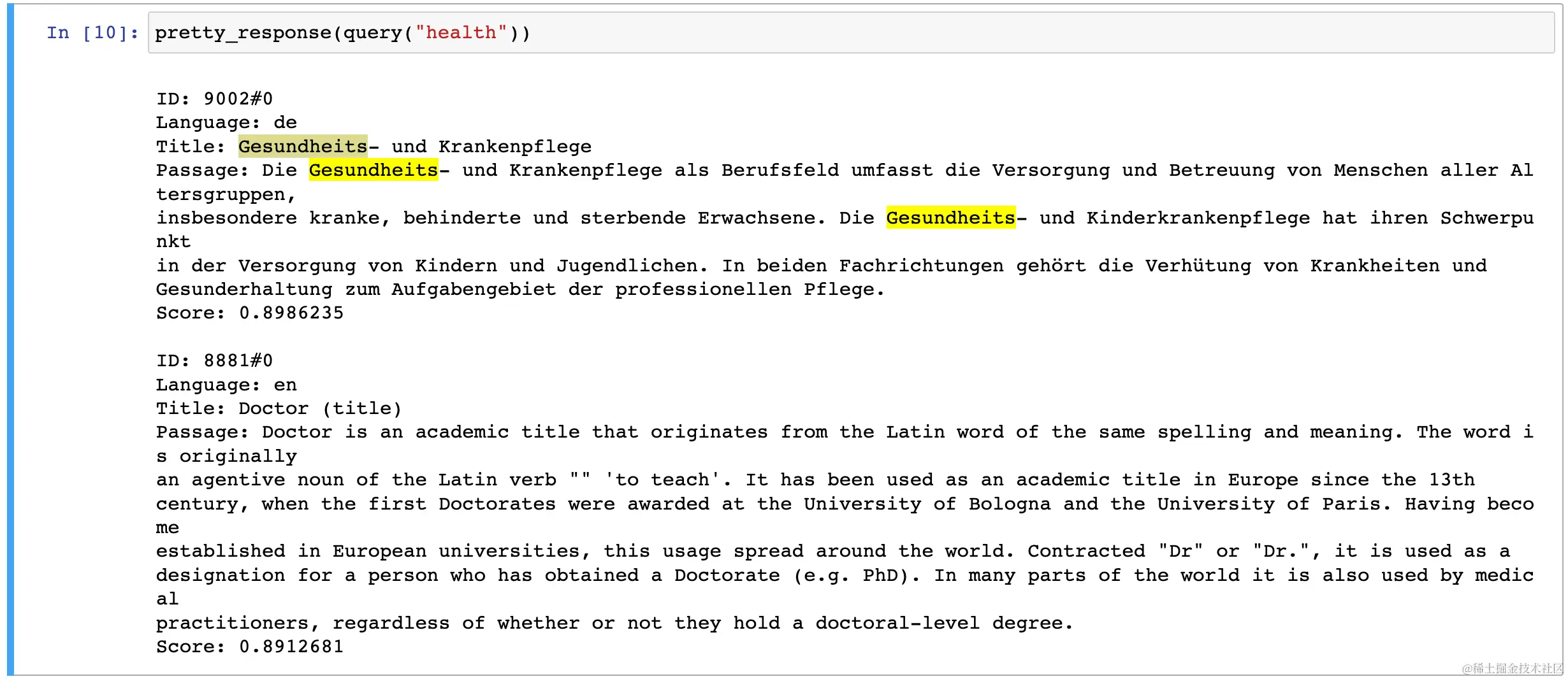 请注意,在上面的结果中,我们看到有关医疗保健的文档,即使是德语,也与查询 “health” 匹配得更好,而英语文档则没有具体谈论健康,而是更广泛地谈论医生。 这就是多语言嵌入的力量,它可以跨语言嵌入含义。