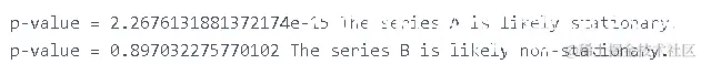正如我们所见,基于时间序列 A 的检验统计量(与特定的 p 值对应),我们可能无法拒绝原假设。因此,A 系列很可能是静止的。另一方面,B系列被假设检验拒绝,所以这个时间序列很可能是非平稳的。