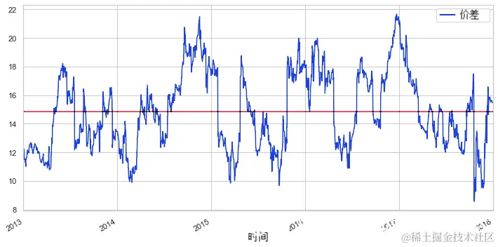 现在我们可以绘制这两个时间序列的价差。为了实际计算价差,我们使用线性回归来获得我们两个证券之间的线性组合的系数,正如之前提到的恩格尔-格兰杰方法。