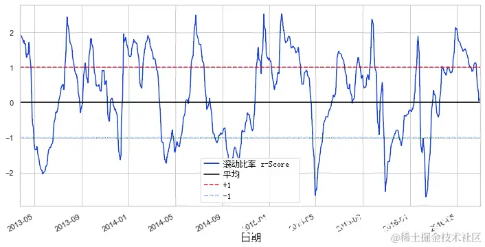 - 每当 z 得分高于 1 时,卖出(-1),这意味着我们预计比率会下降。