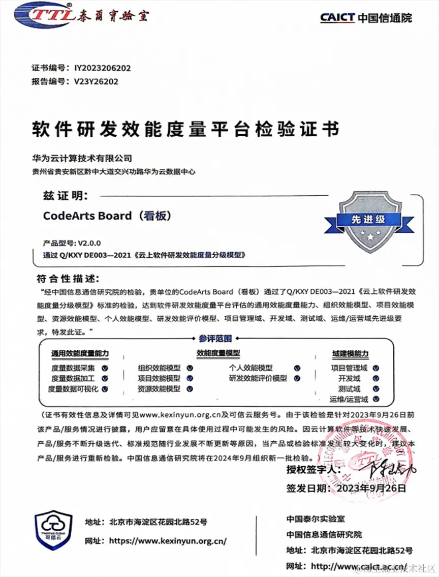 9月26日,华为云CodeArts Board获得了中国信通院《云上软件研发效能度量分级模型》的先进级最高级评估,达到了软件研发效能度量平台评估的通用效能度量能力、组织效能模型、项目效能模型、资源效能模型、个人效能模型、研发效能评价模型、项目管理域、开发域、测试域、运维/运营域的先进级要求,所有能力项要求全部通过,华为云CodeArts Board成为国内研发效能度量领域能力全面领先的云服务。