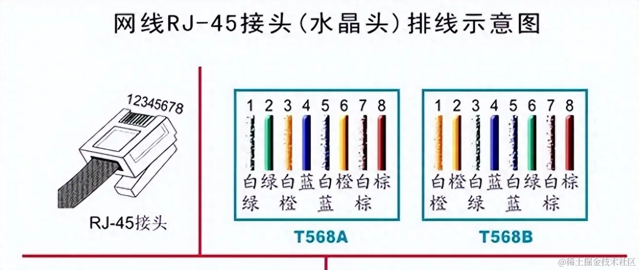 网线内部是四对双绞线,其中1,2和3.6线对是传递数据信号的,剩下的4.5和7.8线对是空闲线对。