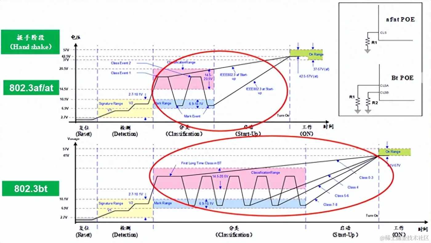 对应到电路图中,BT 协议会有两个 Class 电阻,而 af/at 协议只有一个 Class 电阻。其他阶段是类似的。