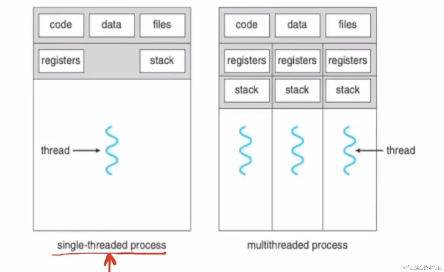 这时,我们的线程就登场了,一个进程有多个线程,这样单个程序也具备并发能力了。如下图:如果只有一个线程就入下图的左侧部分,多线程的话就是下图右侧部分。