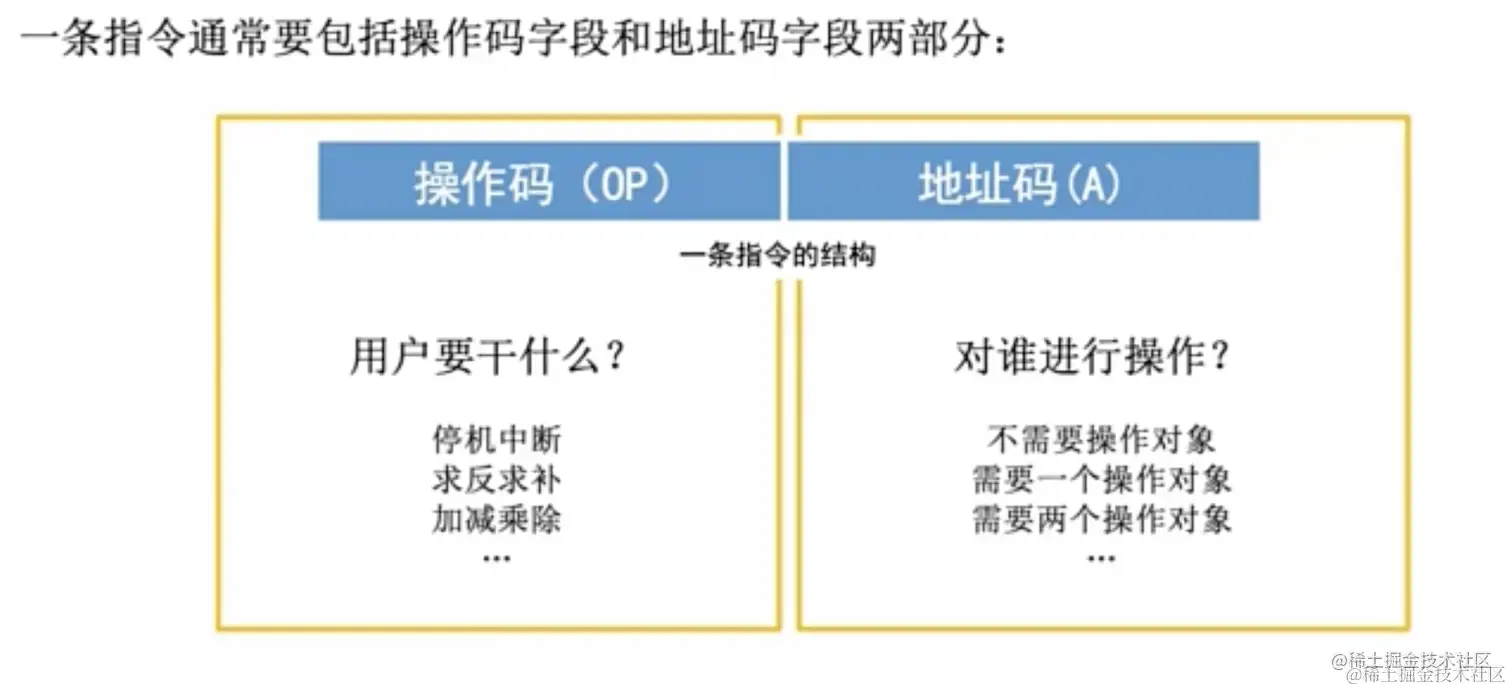 一条指令就是机器语言的一个语句,它是一组有意义的二进制代码。一条指令通常包括操作码(OP) + 地址码(A)