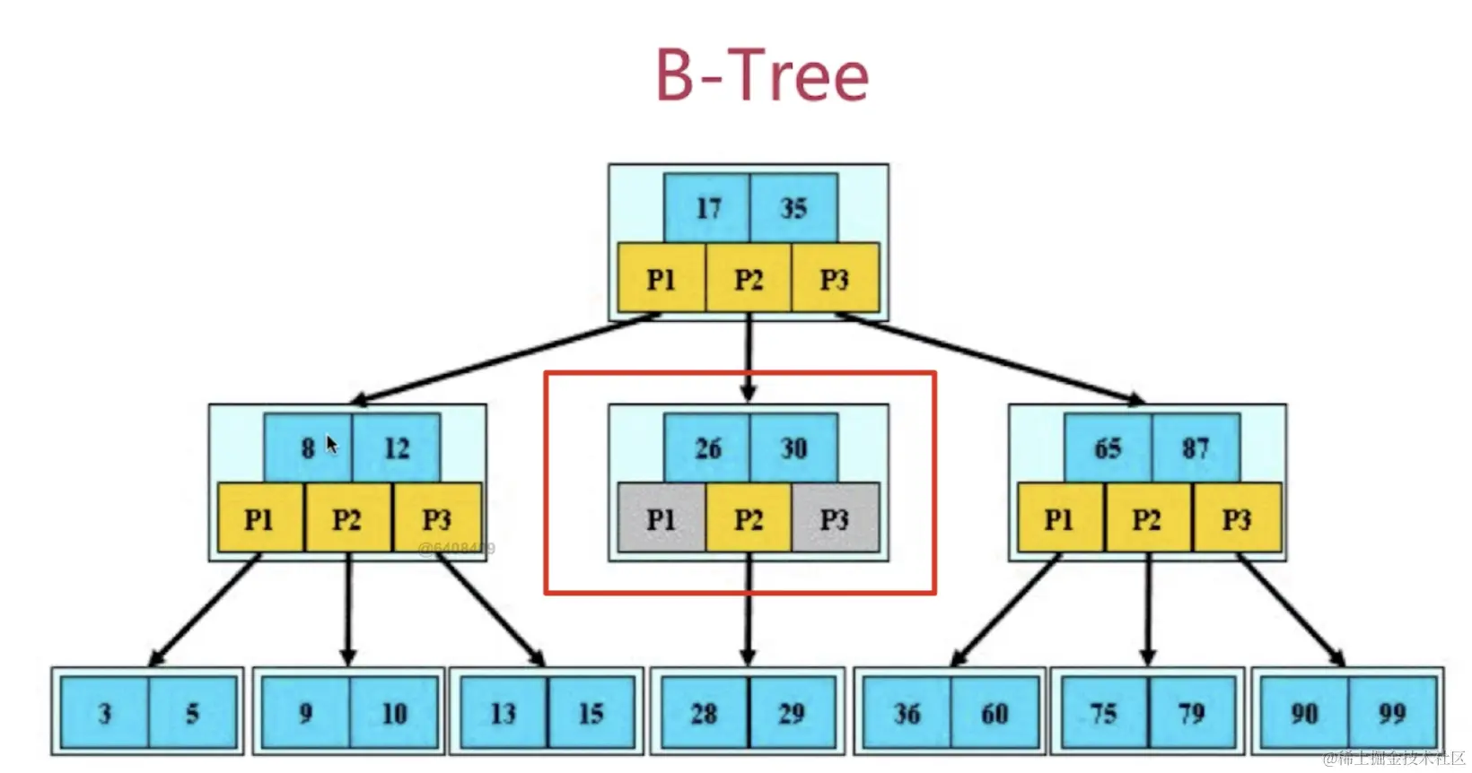 它的优点是什么,我们可以进行随机访问,因为存储索引的数据结构在linux的ext4系统里是b树,b树支持随机查找。B树示意图如下(这个不深究了,属于数据结构和算法的内容)。