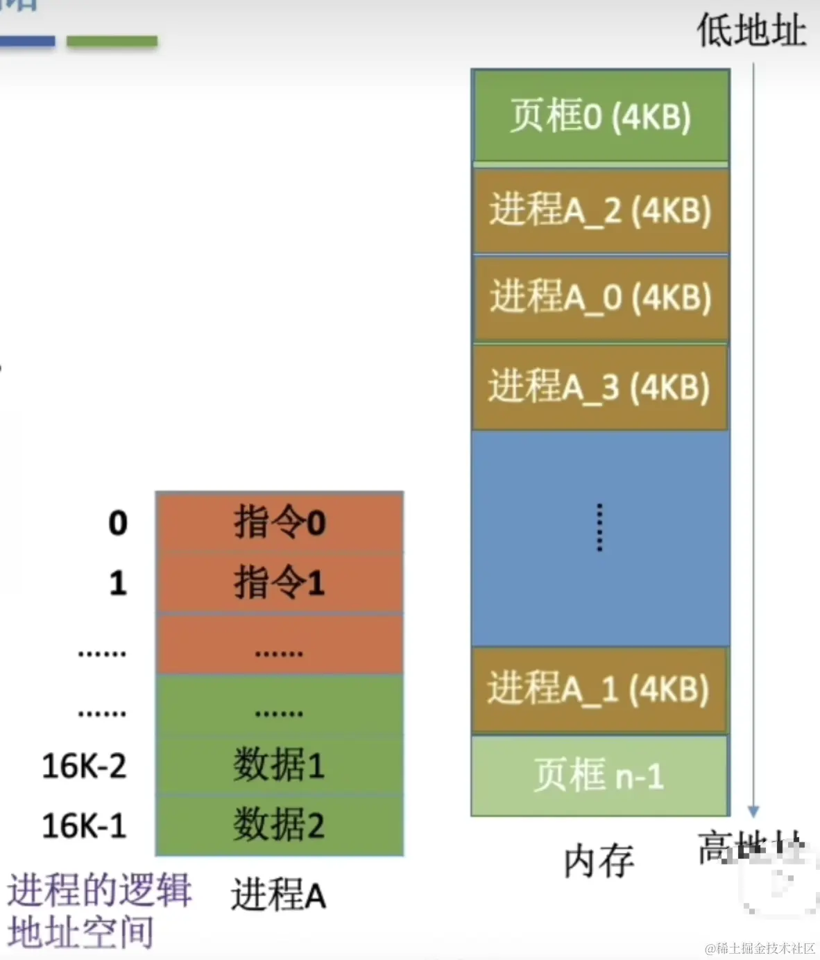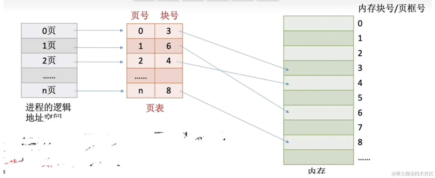 有的同学肯定想,分散后,我咋知道内存上哪些部分是存放进程A数据的呢?所以我们还需要一个表,记录进程上的逻辑块号,跟内存上的块号的映射关系。