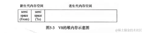 新生代中的对象主要通过Scavenge算法进行垃圾回收。这是一种采用复制的方式实现的垃圾回收算法。它将堆内存一分为二,每一部分空间成为semispace。在这两个semispace空间中,只有一个处于使用中,另一个处于闲置状态。处于使用状态的semispace空间称为From空间,处于闲置状态的空间称为To空间。
