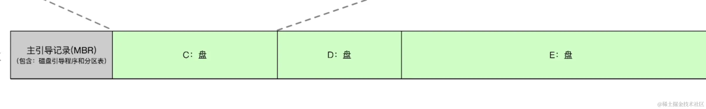 可以看到,在第一个扇区,存放着主引导记录,主要包含了磁盘引导程序和分区表。分区表不用说了,这个大家能理解,尤其是windows,我们划分为c盘,d盘什么的。磁盘引导程序一个主要作用就是扫描分区,然后执行主分区里引导程序,在windows一下一般都是c盘,linux则是情况而定。如下: