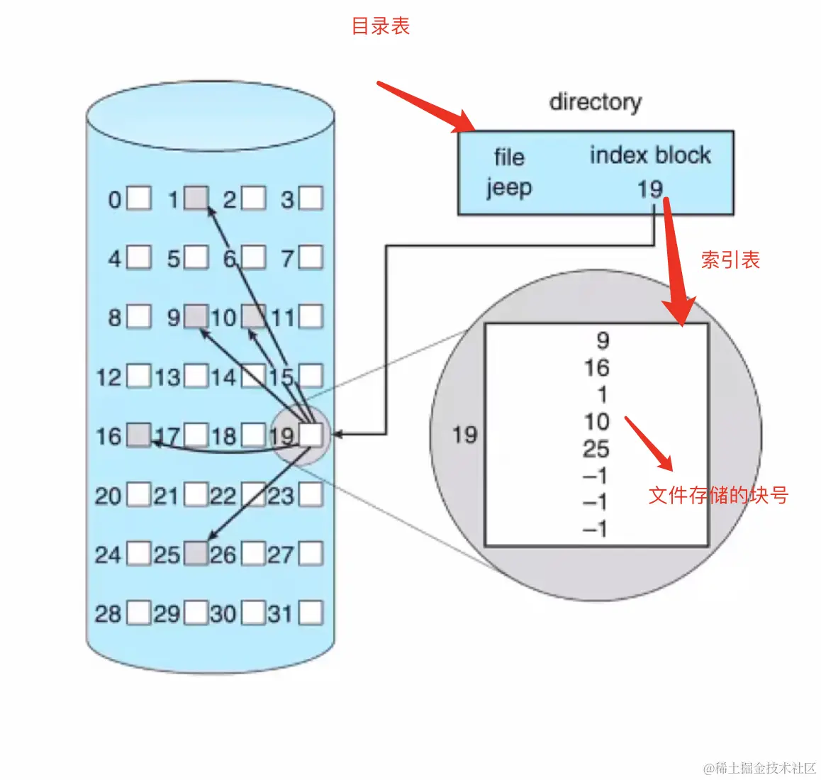 这里可以看到,目录表,一般存放的是这个文件存储的物理块号在哪里,但索引分配是存储了索引表,在索引表上存储里对应物理块号的哪一个。(还有多级索引表,这里不引申了)