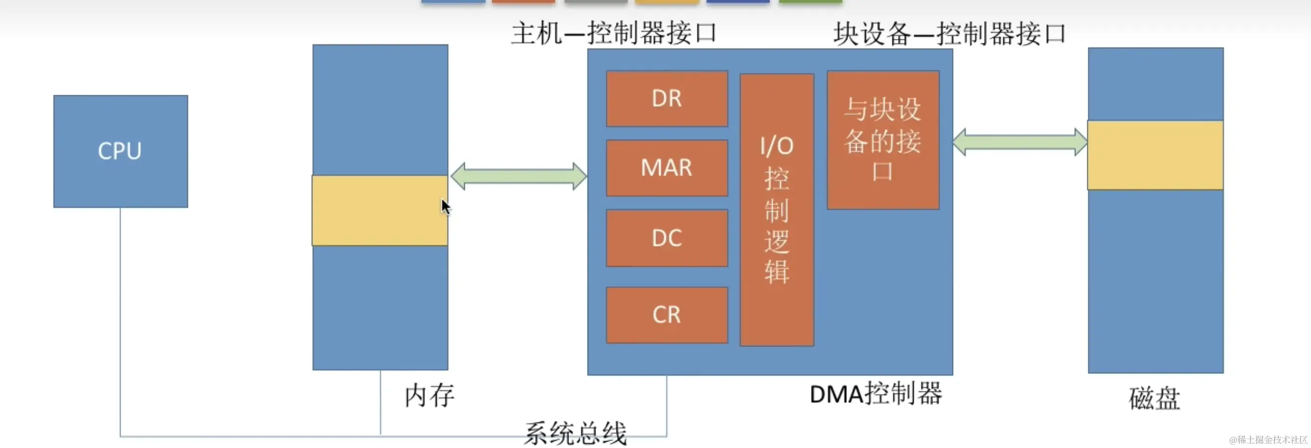 对于块设备的数据传输,有一种方式叫DMA,如下图