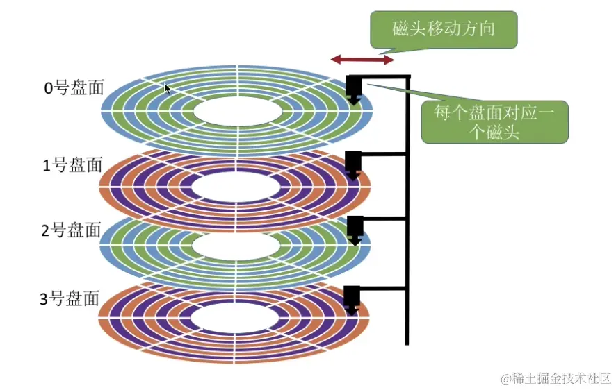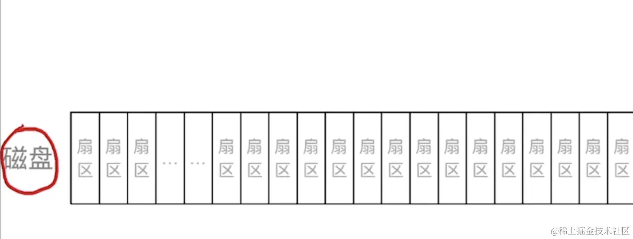 上面的是黑色部分,分别是磁头和磁臂,然后磁头读取盘面上的信息。然后磁盘上会有扇区划分,如下图: