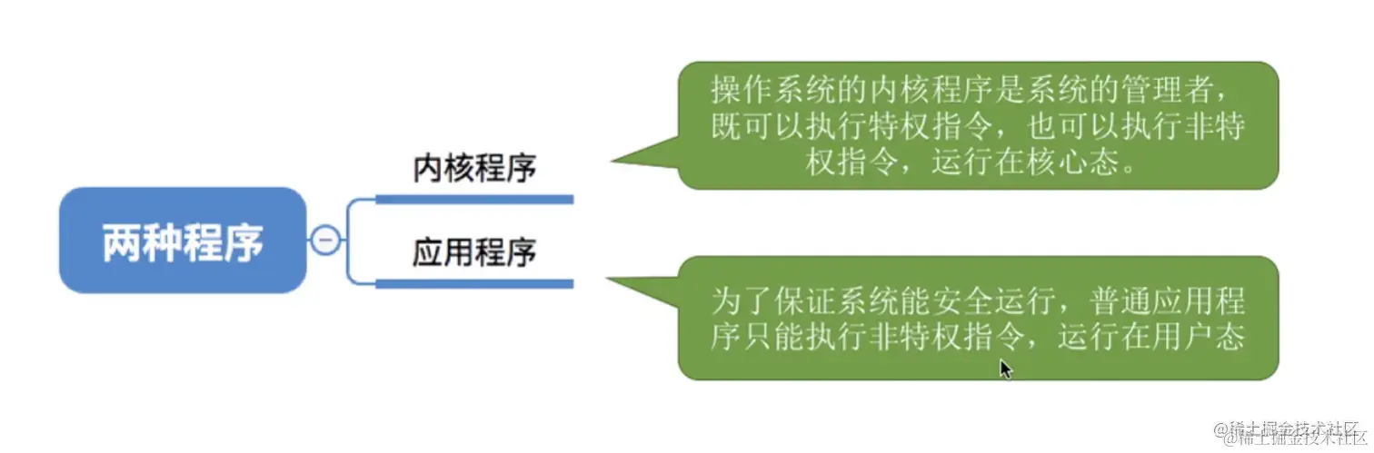 对于应用程序而言,有的程序能执行特权指令,有的程序只能执行非特权指令。所以操作系统里的程序又分为两种: