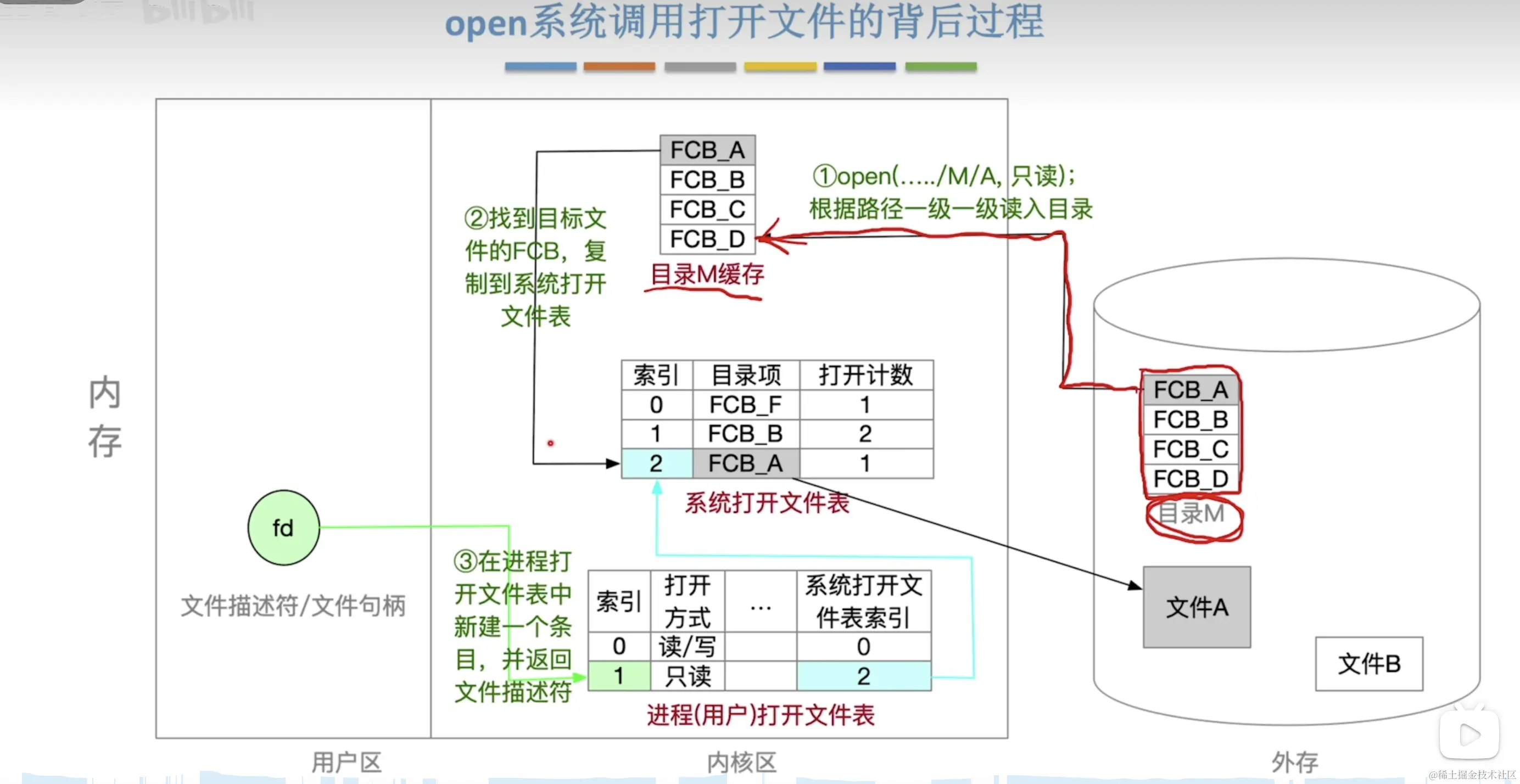 所以当我们打开文件的时候首先是去某个目录下寻找该文件,所以我们的目录就应该存储在硬盘里,并且因为目录访问是非常频繁的,一般开机的时候,目录表就已经加载到内存了。