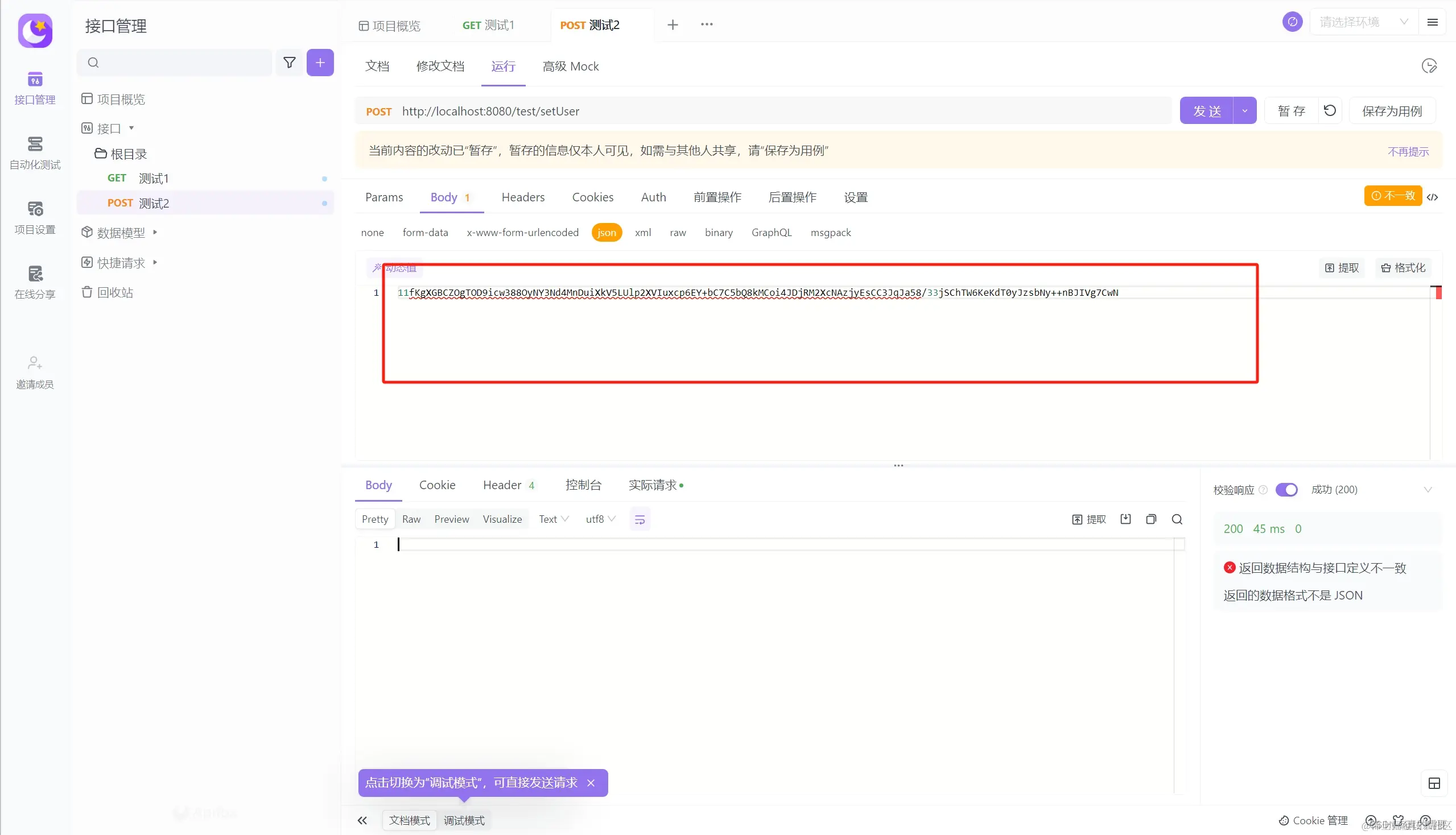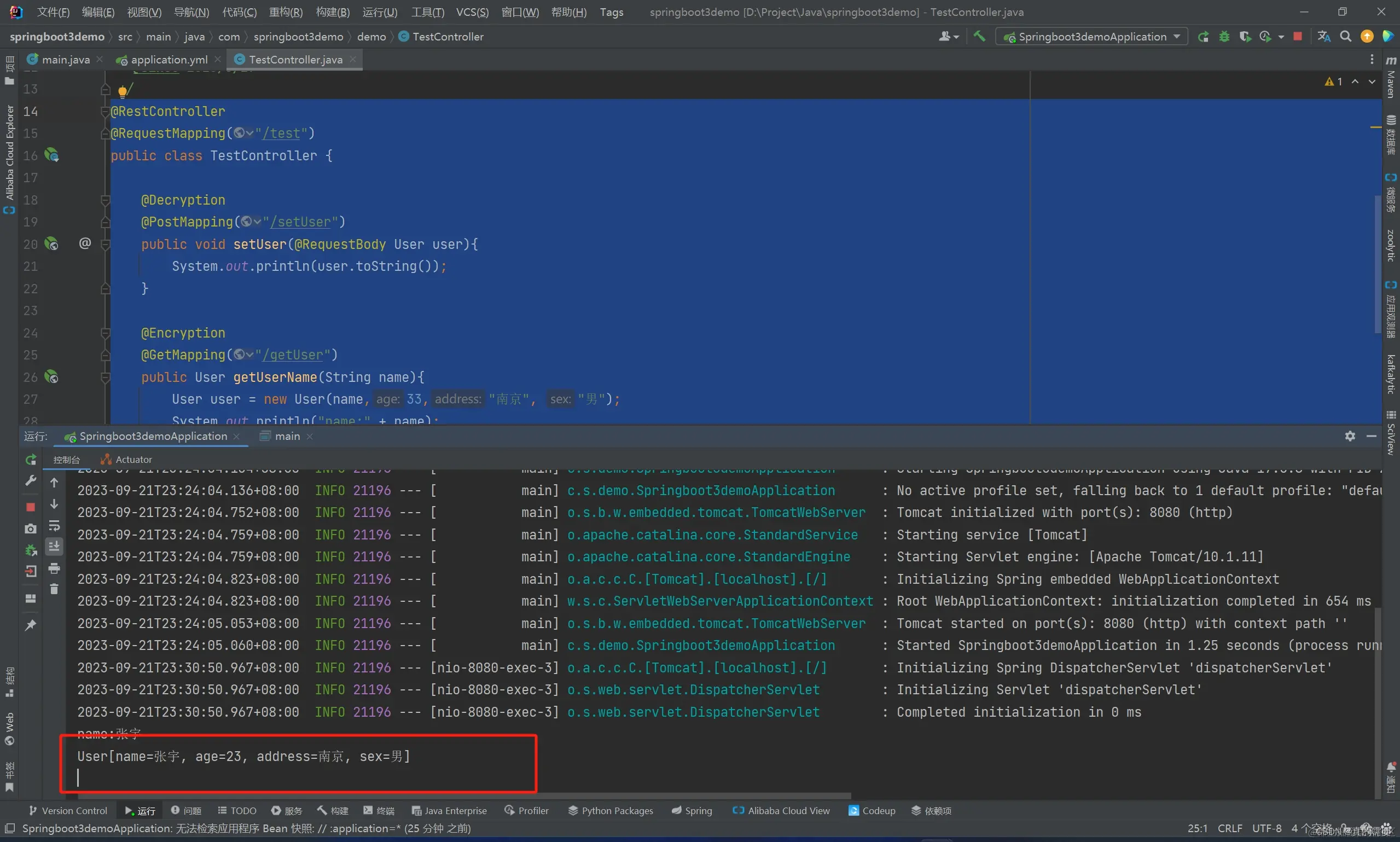 @Decryption 解密注解放在了 /test/setUser 请求接口上面,请求接口传参加密内容会自动解密出来