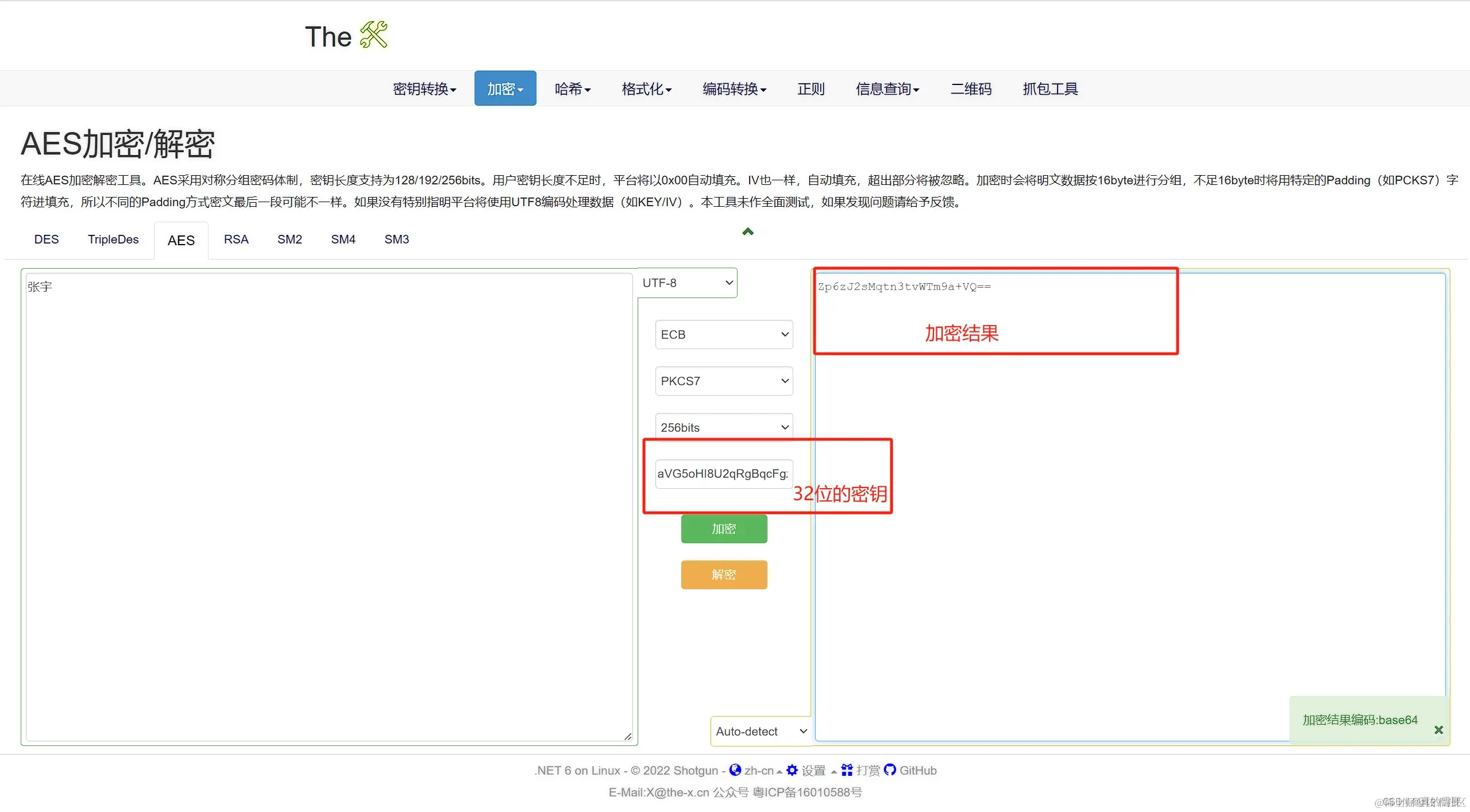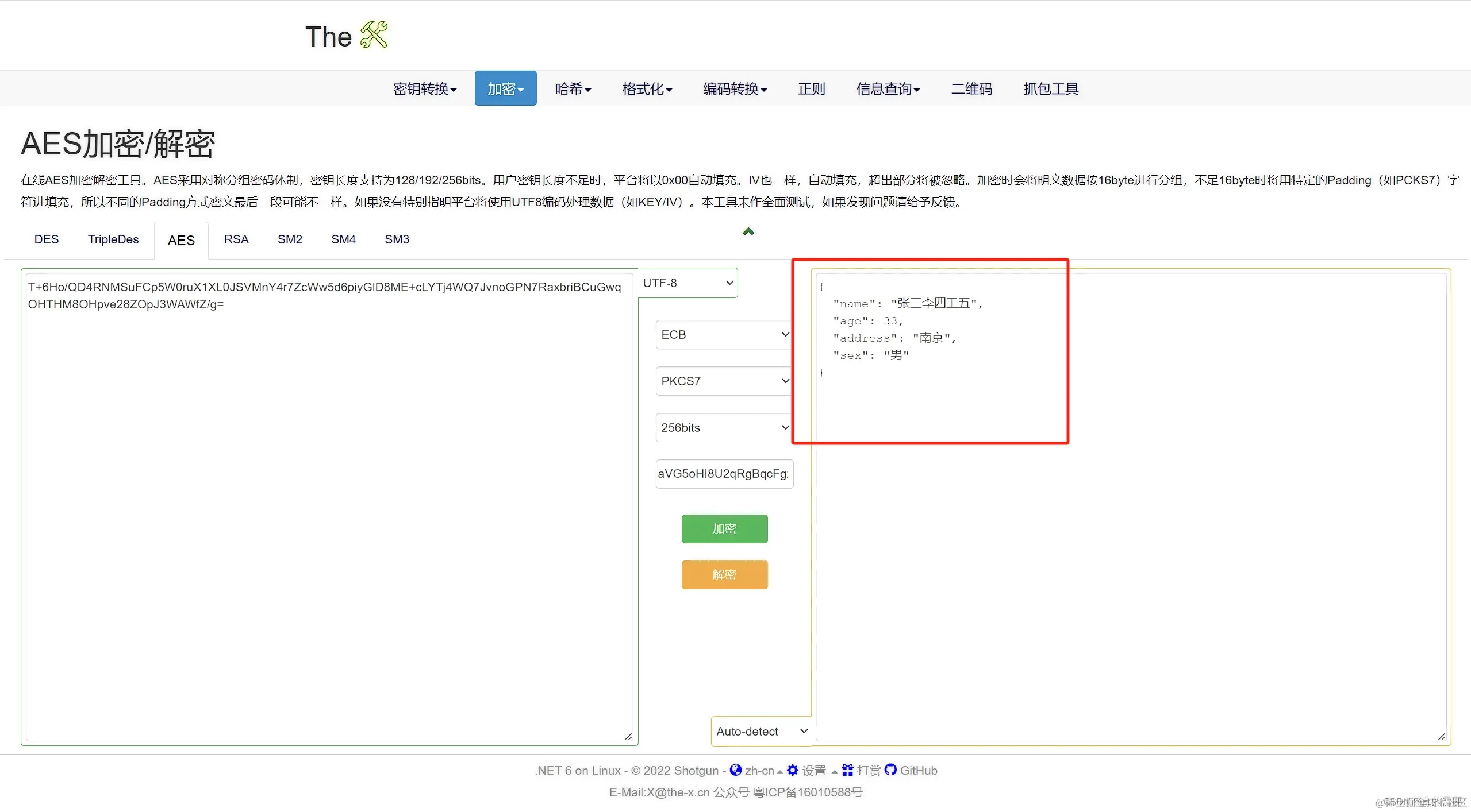 在Controller上加上@ApiEncrypt注解,下面看实现结果,可以使用在线AES加解密网站来测试。