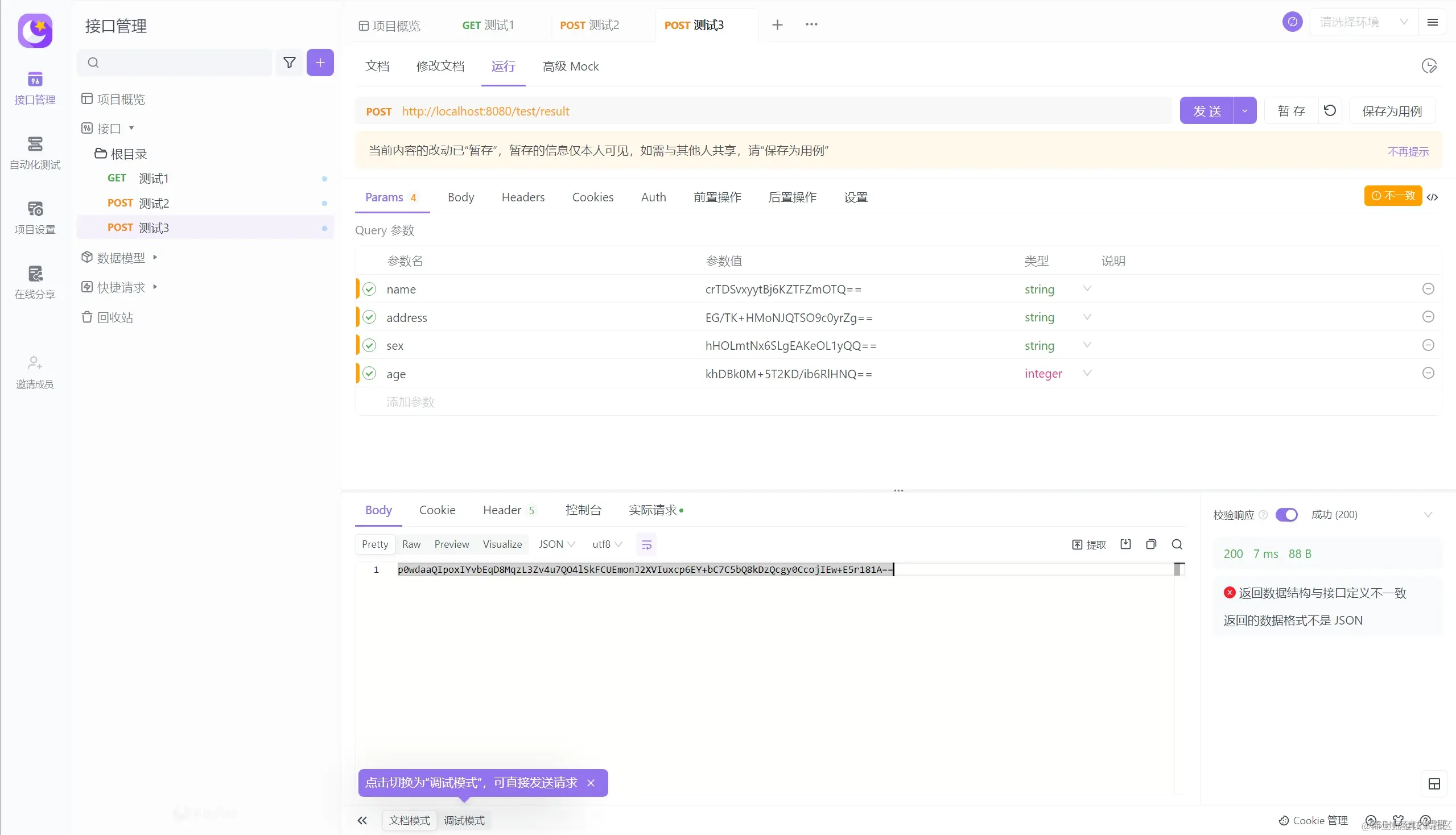 使用刚刚生成的密钥来生成加密结果:Zp6zJ2sMqtn3tvWTm9a+VQ==,使用这个加密过的内容,请求接口