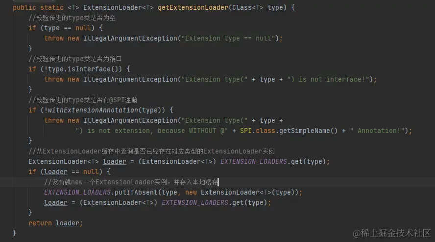 1)我们首先通过 ExtensionLoader的 getExtensionLoader 方法获取一个接口的 ExtensionLoader 实例,然后再通过 ExtensionLoader 的 getExtension 方法获取拓展类对象,源码如下,首先是 getExtensionLoader 方法: