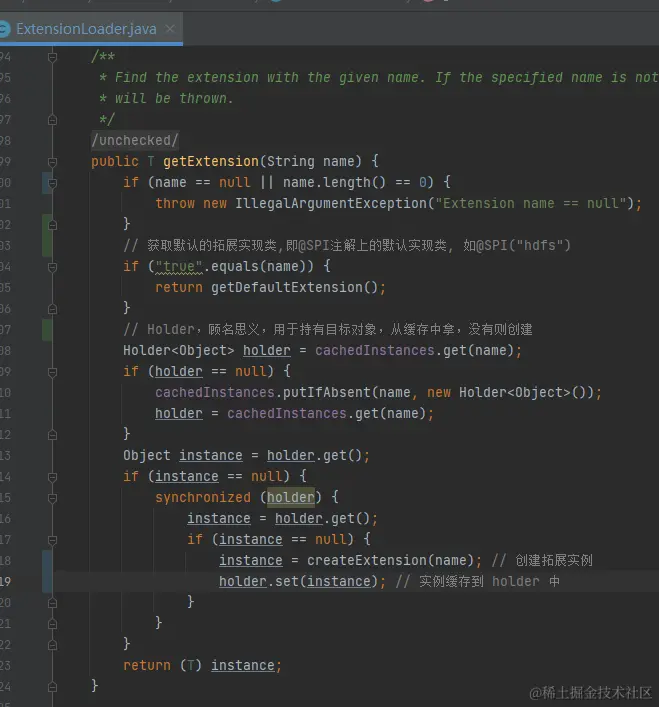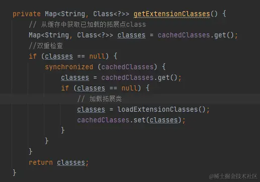 - 通过 getExtensionClasses 从配置文件中加载所有的拓展类,再通过名称获取目标拓展类