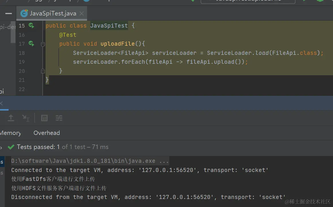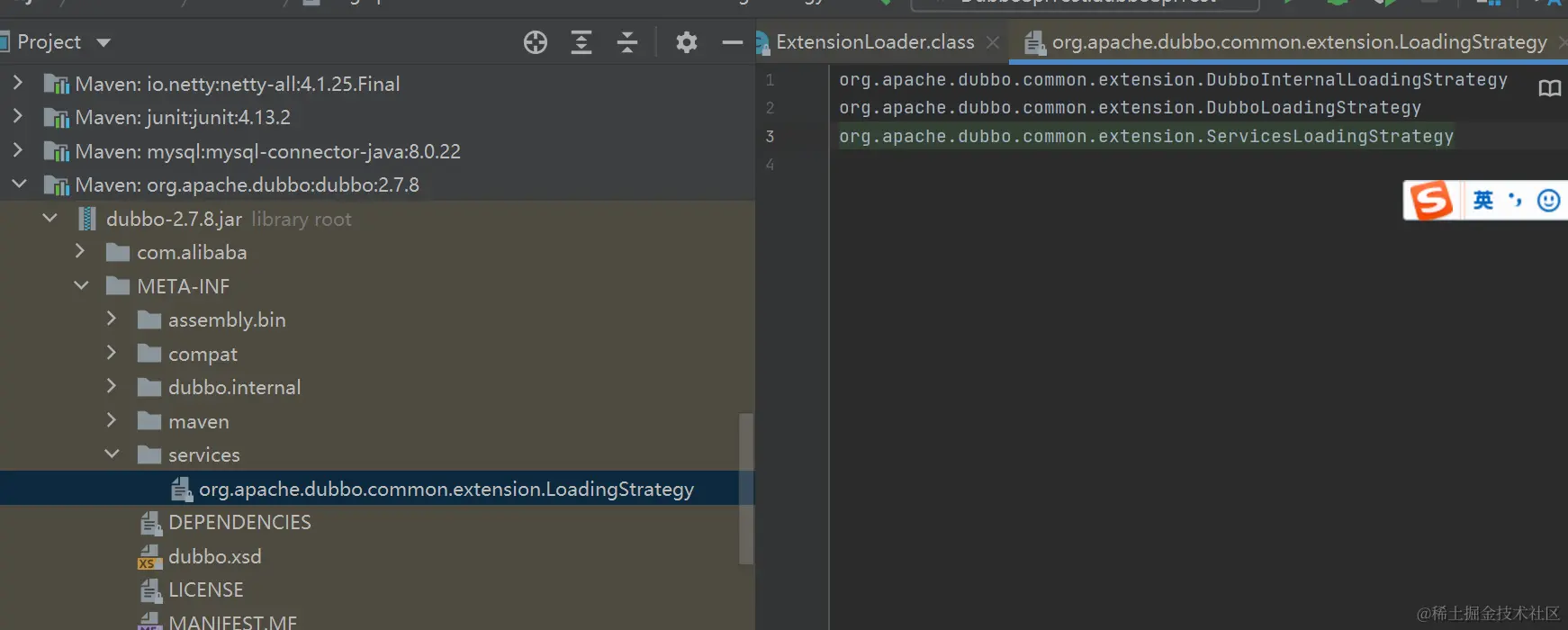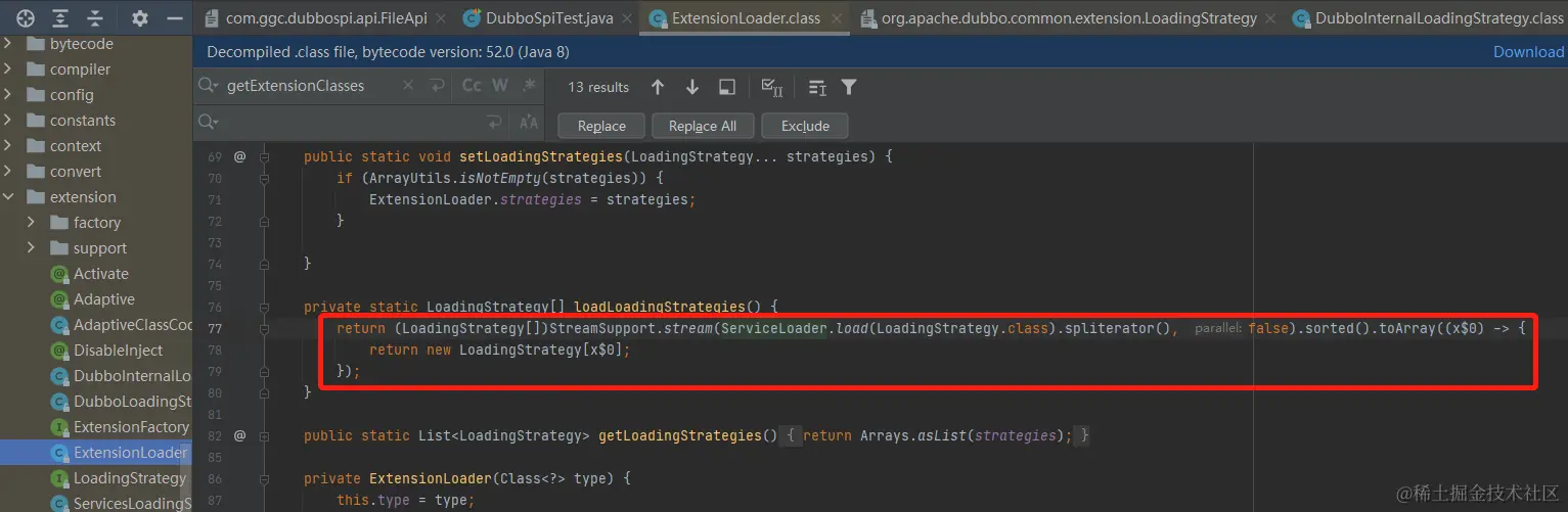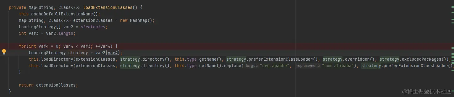 我们看到这里遍历调用了多个策略去加载class的,跟到这里我们发现非常有意思的是:dubbo在加载META-INF目录下的class键值对的时候采用了javaSPI的方式