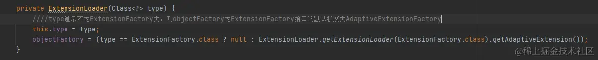 注意这里创建 ExtensionLoader对象的构造方法如下:ExtensionLoader.getExtensionLoader获取ExtensionFactory接口的拓展类,再通过 getAdaptiveExtension从拓展类中获取目标拓展类。